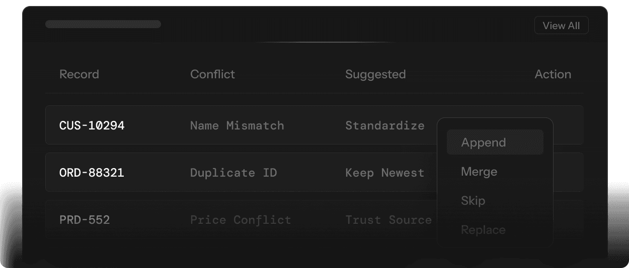Append, merge, skip, or replace records using smart rules.