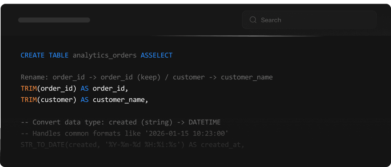 Rename columns, convert data types, apply business logic automatically.